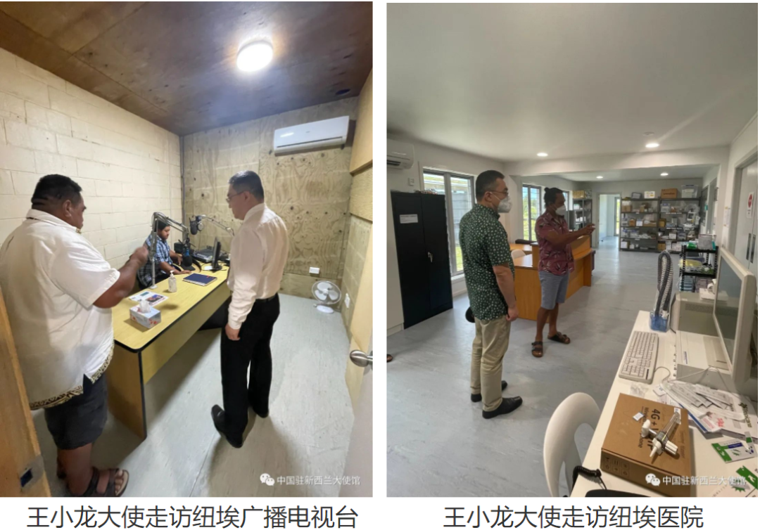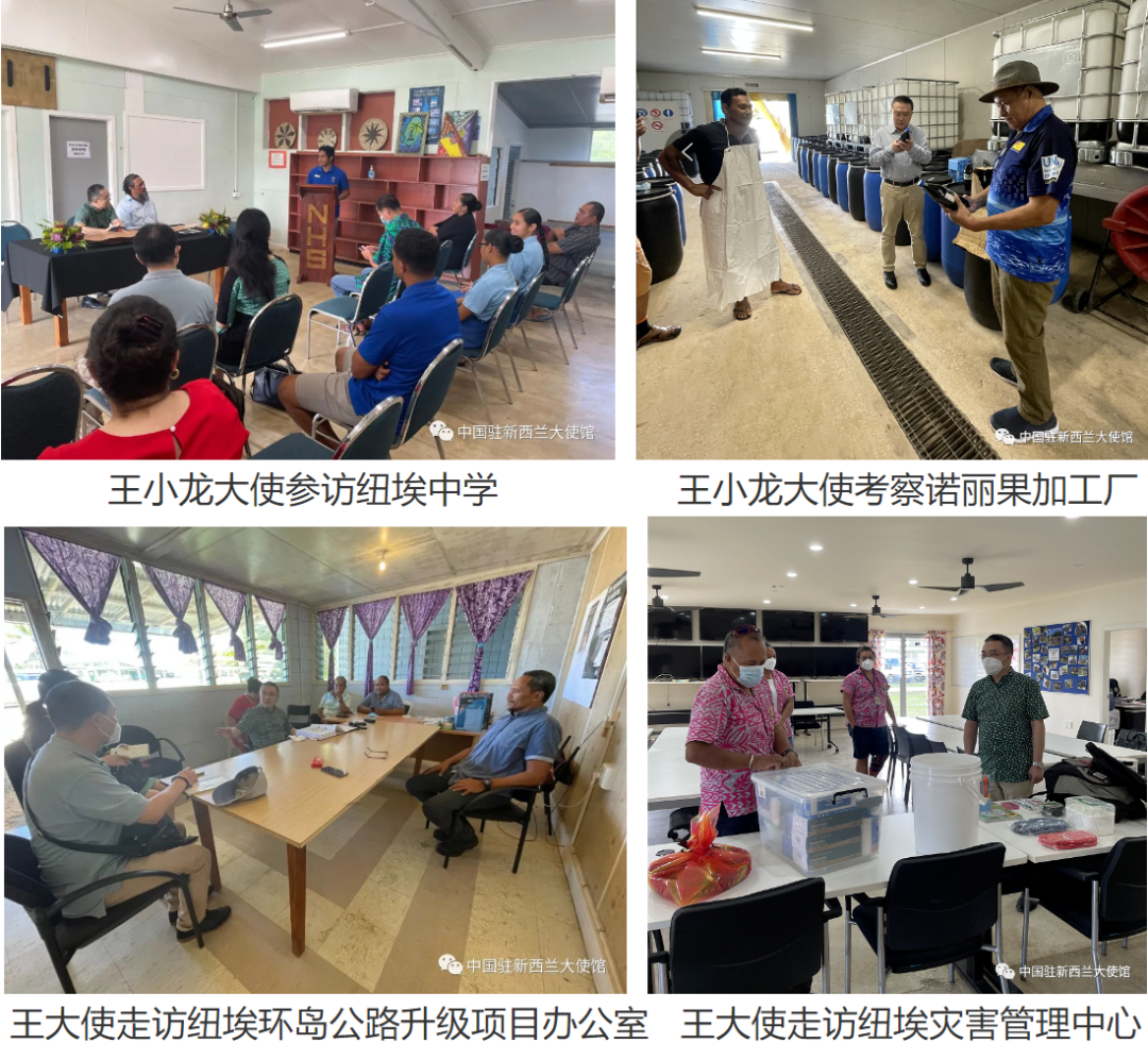 在纽方官员陪同下,王大使还走访了纽埃中学、医院、电视台、博物馆,考察了纽埃政府大楼、灾害管理中心、诺丽果加工厂、港口码头、游客服务中心等设施,并深入调研了中方拟援建的纽埃环岛公路升级项目。