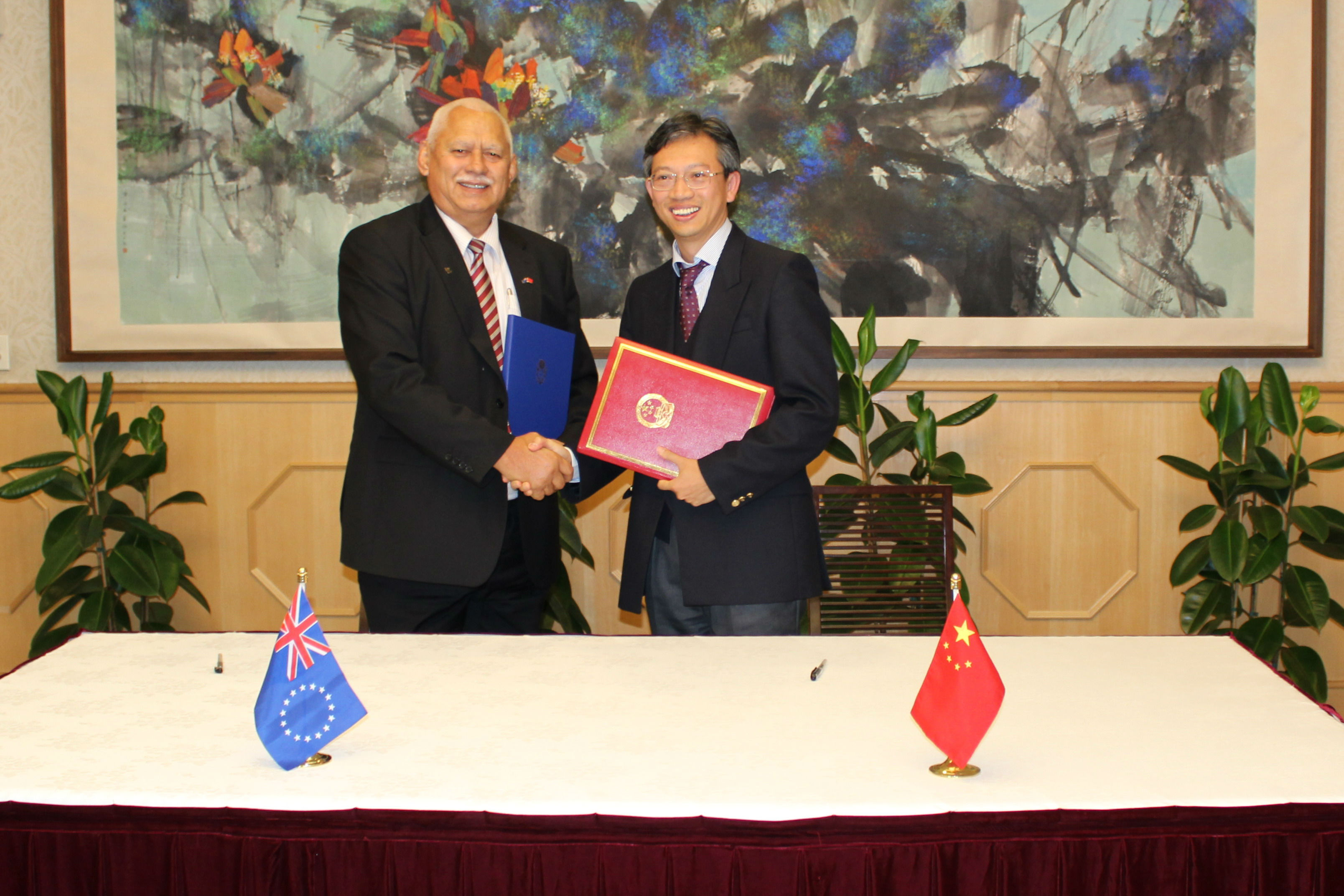 2014年6月6日,驻新西兰兼驻库克群岛大使王鲁彤和库克群岛驻新西兰高专马塔波在惠灵顿代表各自政府签署了中国援助库克群岛外岛重型机械设备项目的换文。