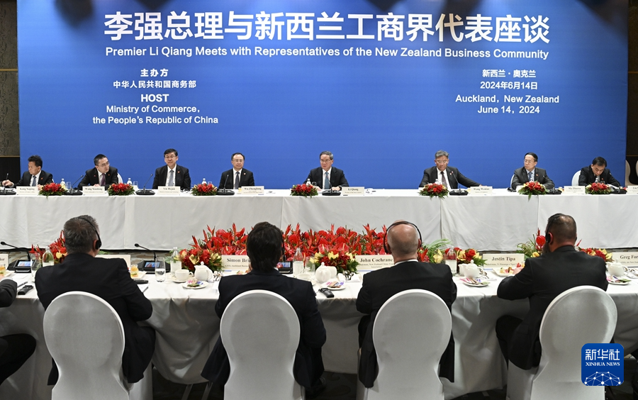 新华社惠灵顿6月14日电(记者刘畅 许可)当地时间6月14日下午,国务院总理李强在奥克兰同新西兰工商界代表座谈。奥克兰商会、新中贸易协会、新西兰航空公司等约20家新西兰商会和企业负责人出席。